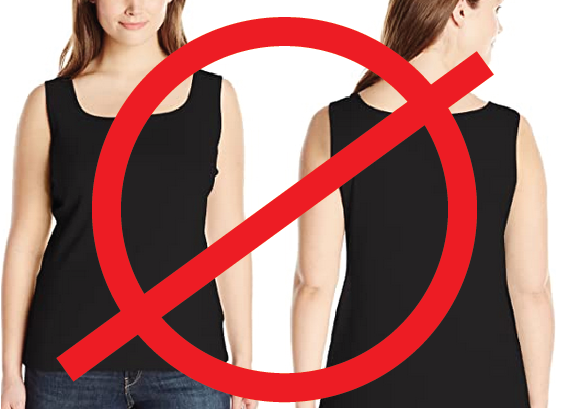 Spaghetti Strap You’d think based on the rules above that this design is totally safe, and it might be depending on your muscularity. What to be aware of with spaghetti straps is the placement of the straps. The closer the straps are to the neck, the more slimming the neckline is. |