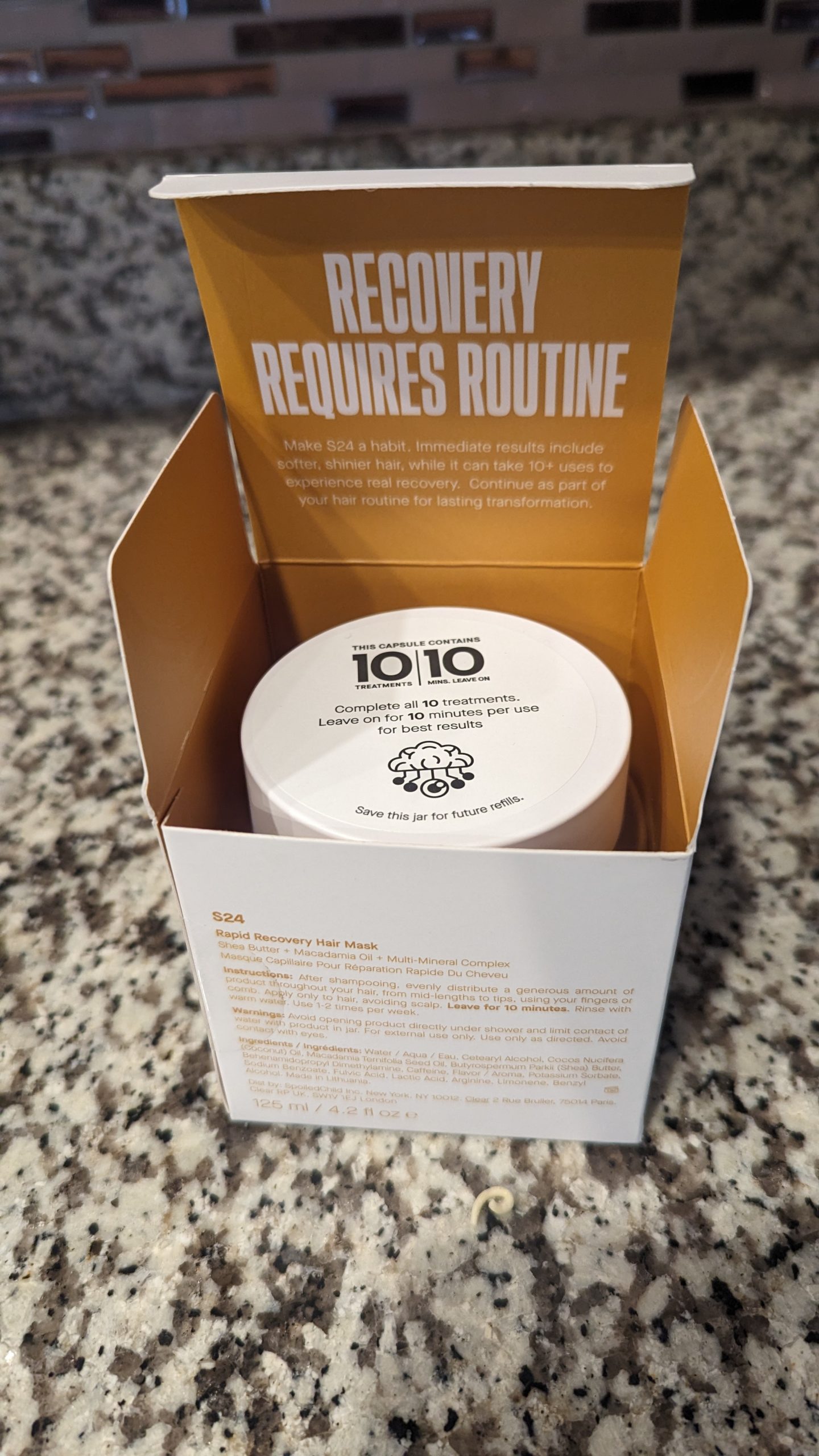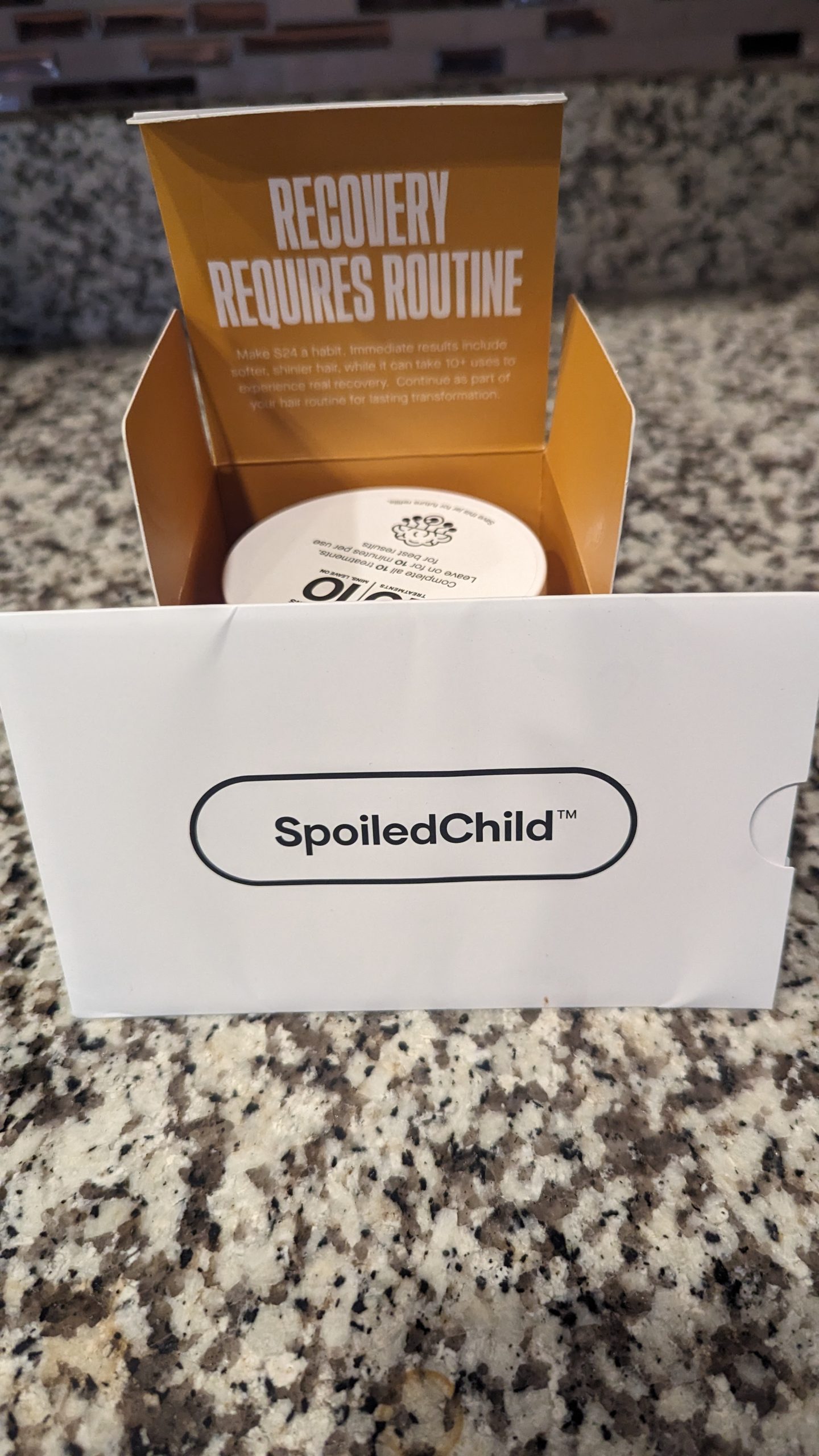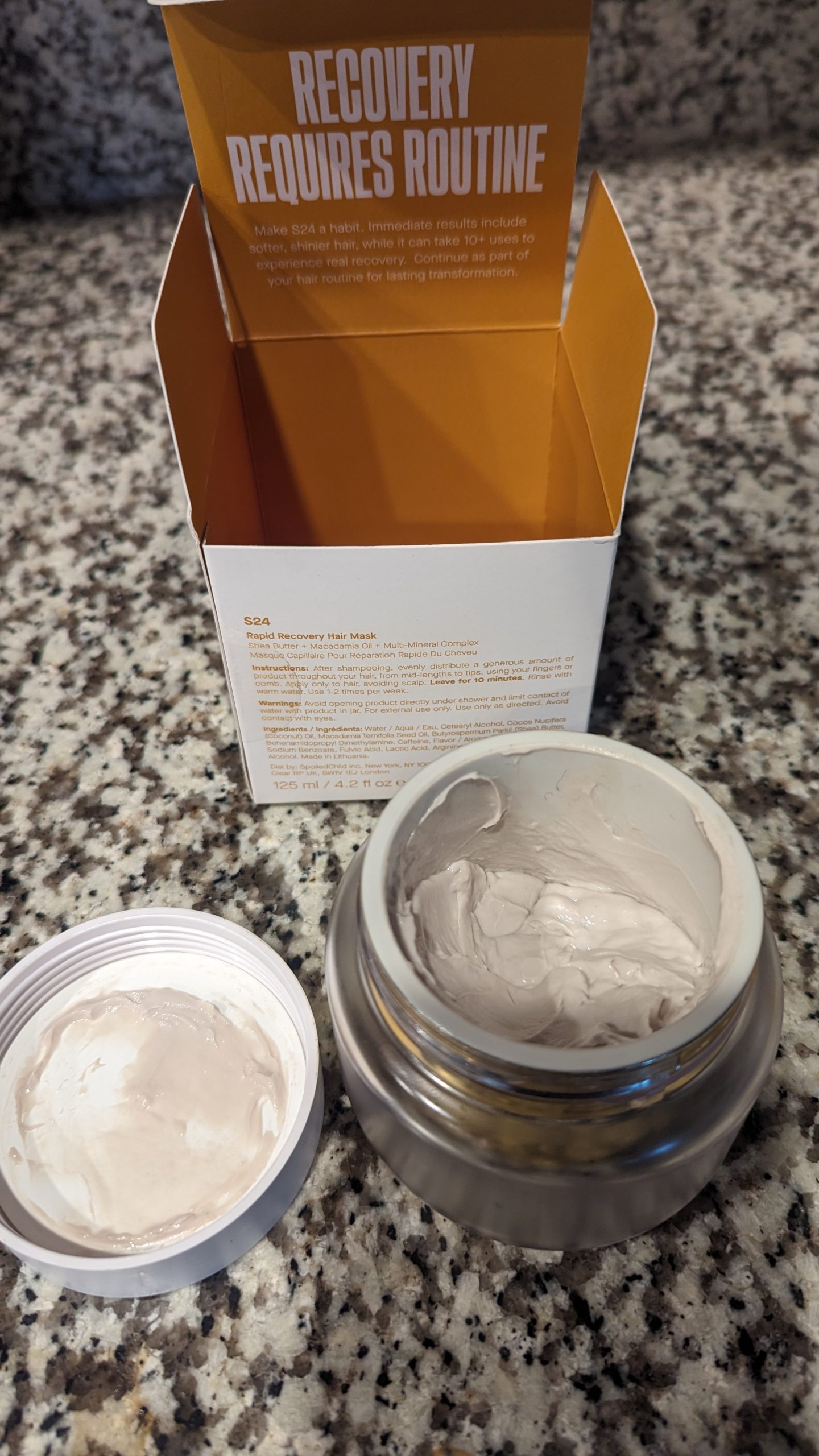I took the SpoiledChild welcome quiz and was recommended the S24 hair mask. I applied it post-gym to my hair and left it in for about 6 minutes (I didn’t have the 10 minutes recommended in the instructions). After rinsing out the majority of the product, I put my hair up in a bun and went about my day, and left the hair mask jar with my son to try for himself.